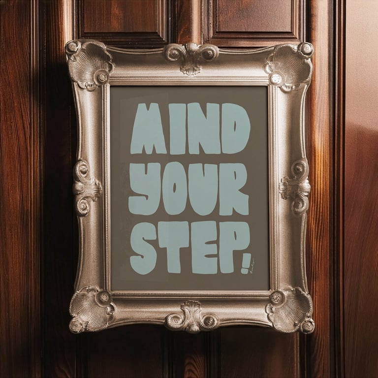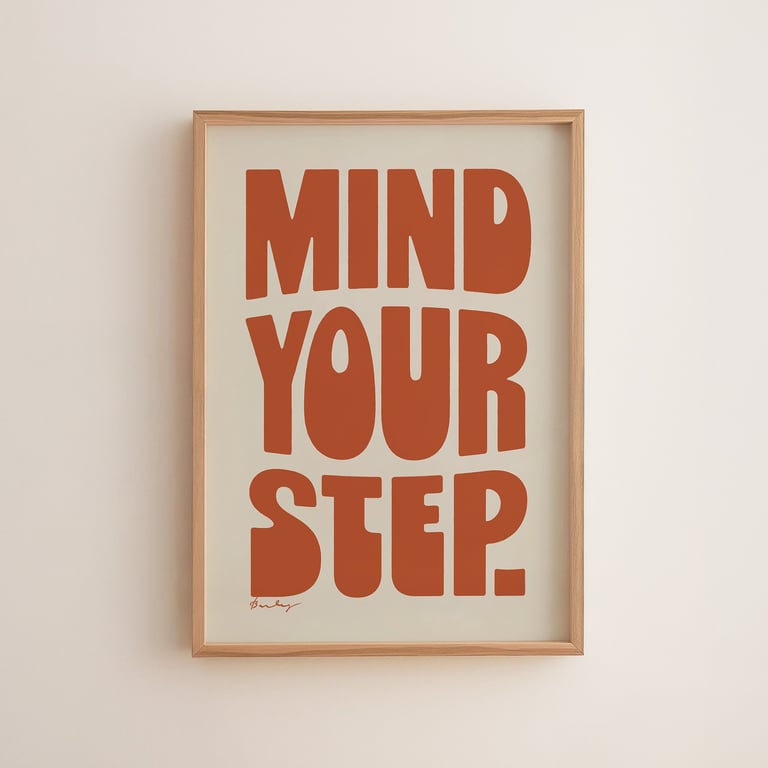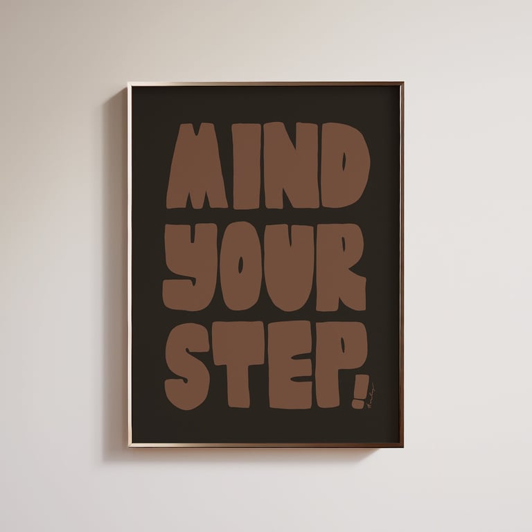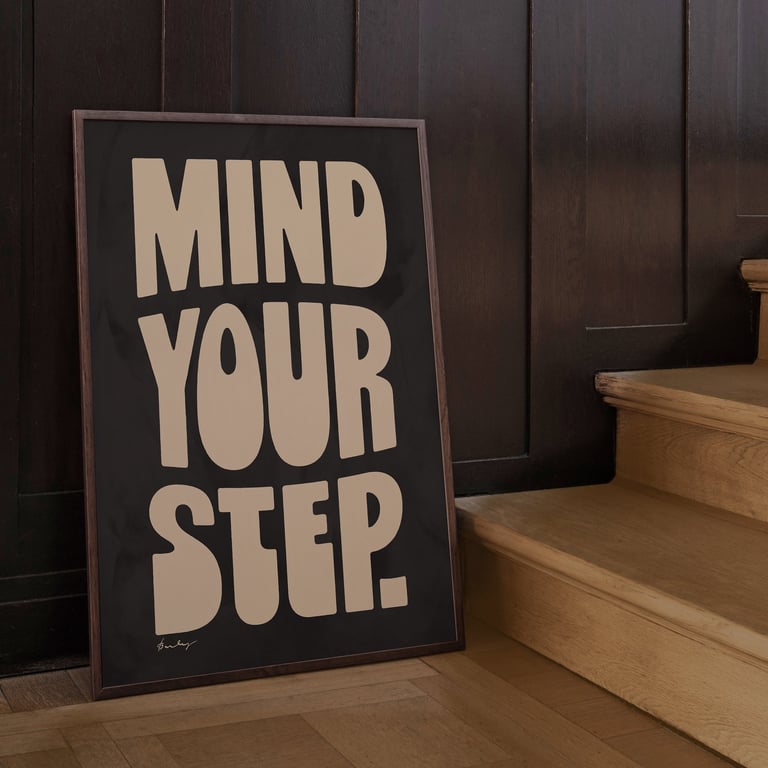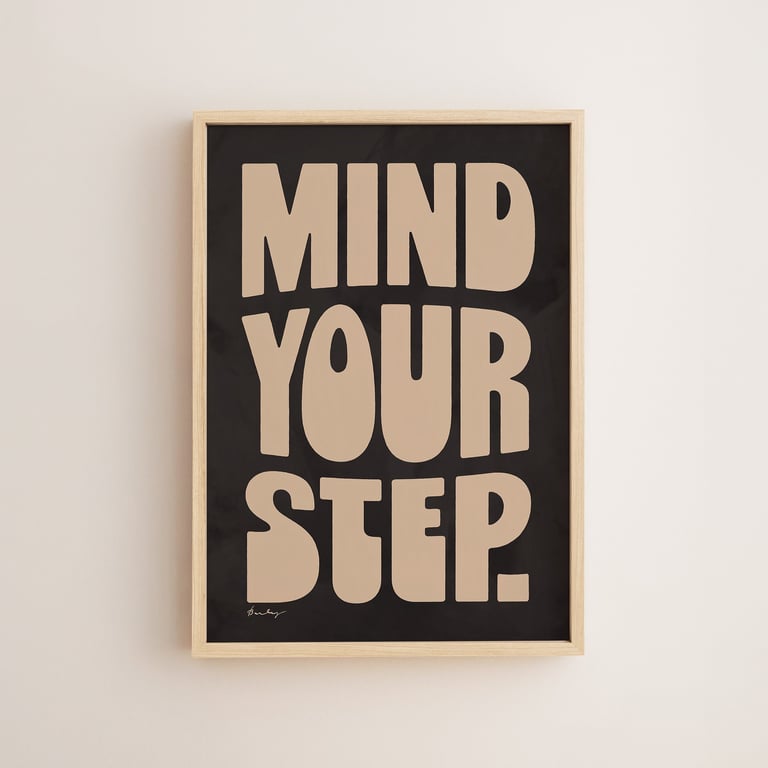 Do you have a doorway with a step that people stumble over? A steep staircase that was built before building codes dictated consistent riser heights and tread widths? An uneven floor that's charming, but a trip hazard? You should probably warn people, but now you don't have to use those stark and flair-less signs from the hardware store. This piece will let people know to be careful and cautious with 70s-inspired groovy typography.