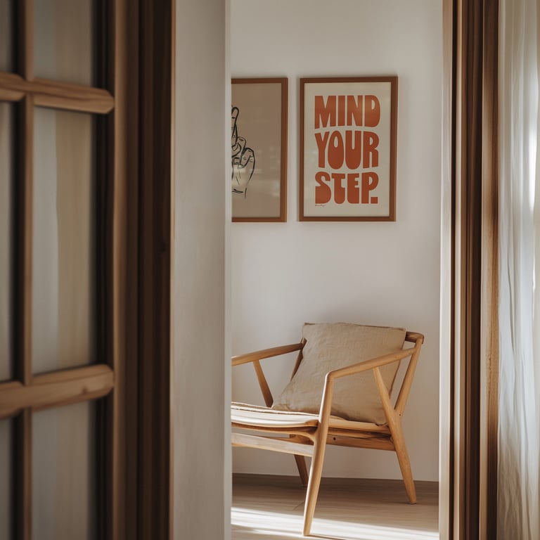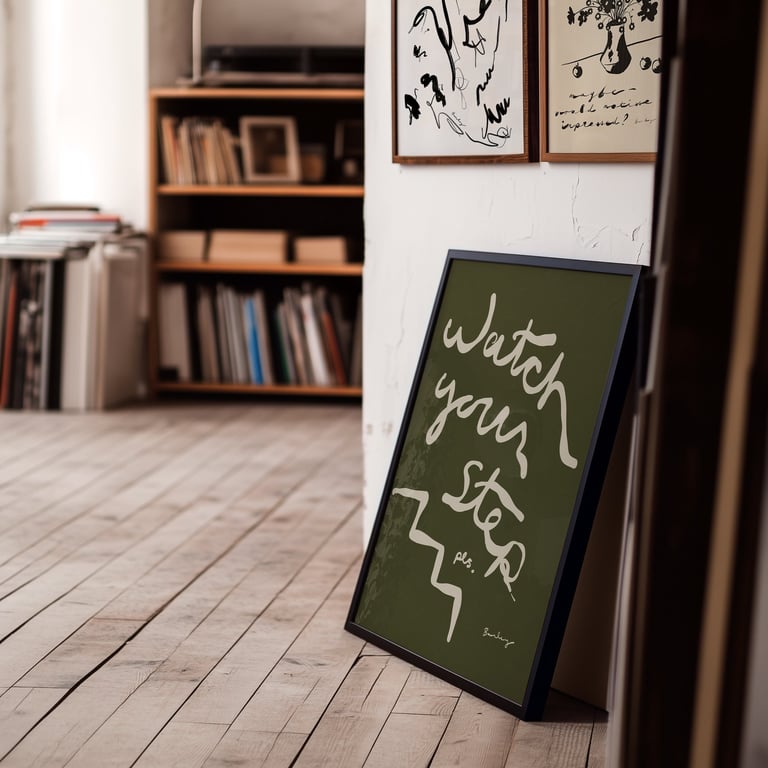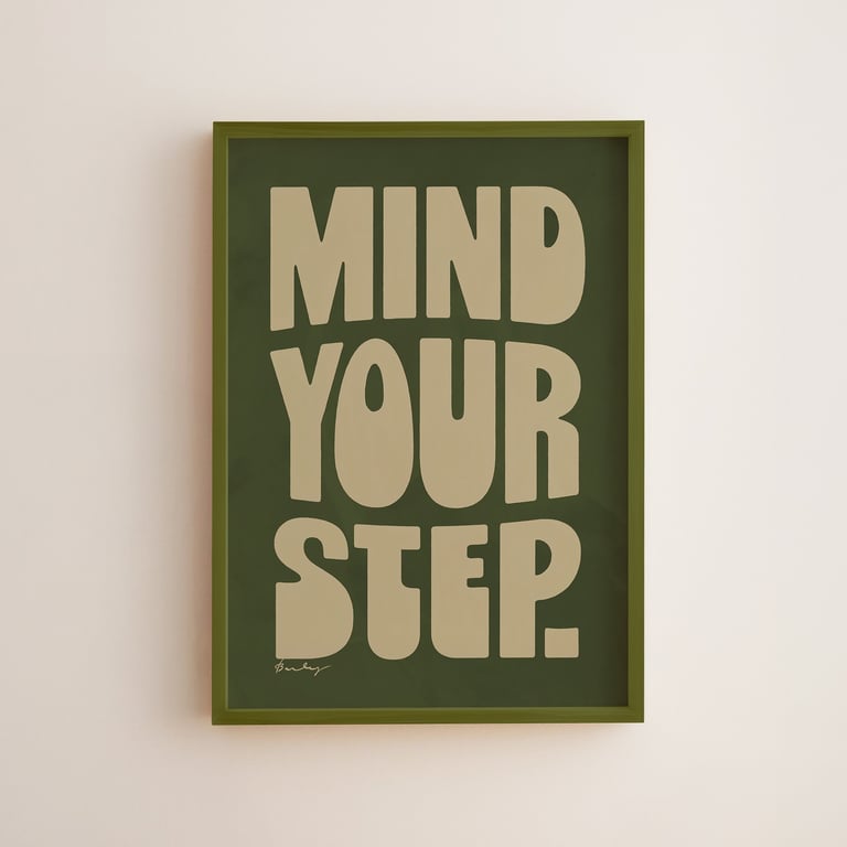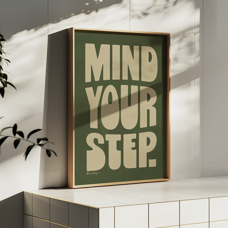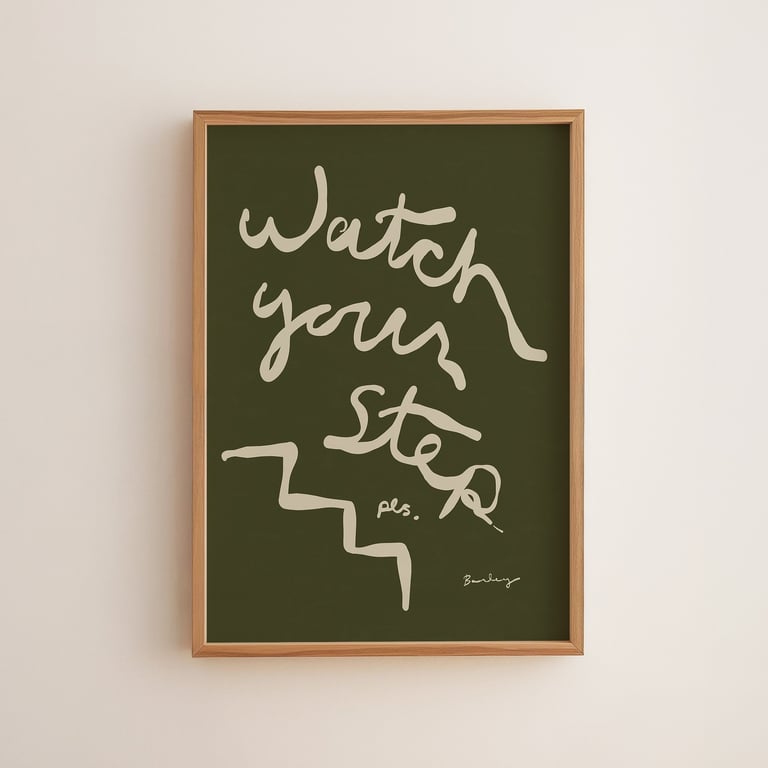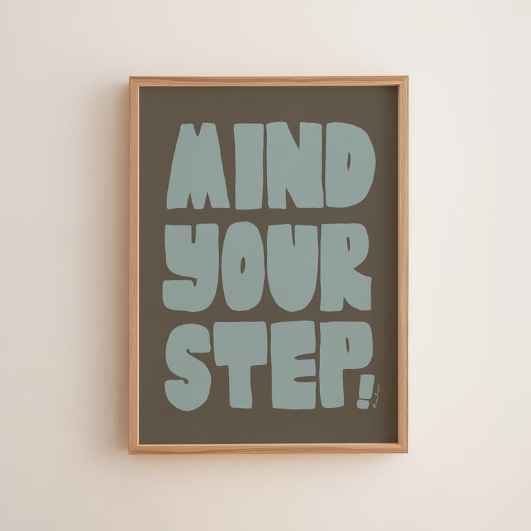 Do you have a doorway with a step that people stumble over? A steep staircase that was built before building codes dictated consistent riser heights and tread widths? An uneven floor that's charming, but a trip hazard? You should probably warn people, but now you don't have to use those stark and flair-less signs from the hardware store. This piece will let people know to be careful and cautious with 70s-inspired groovy typography.