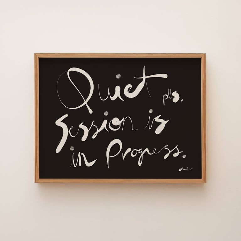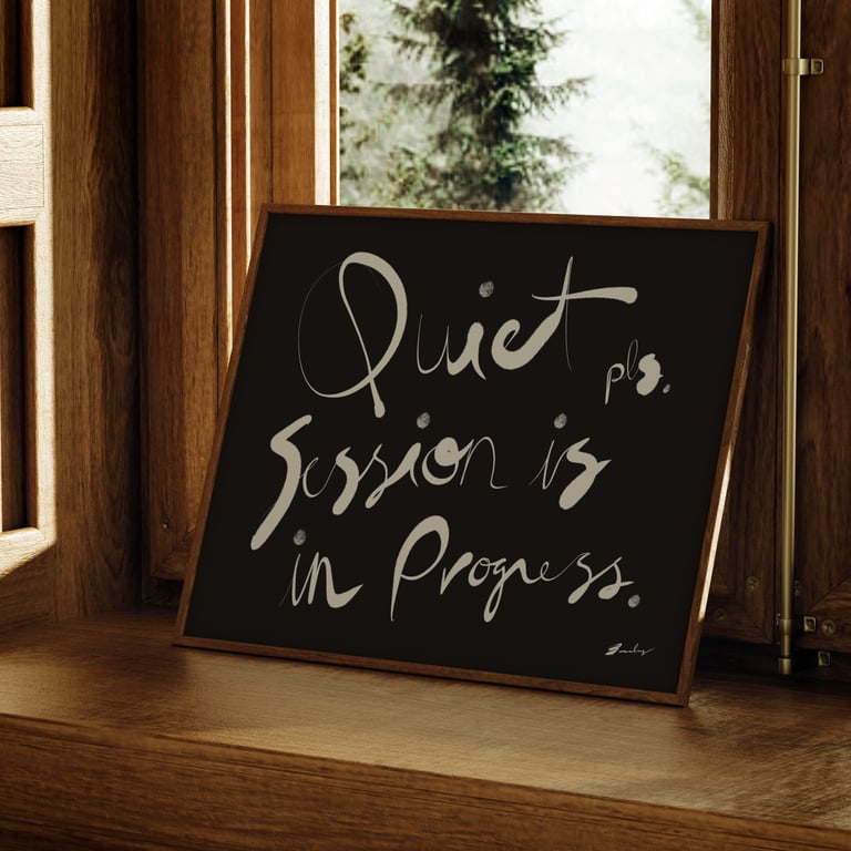 Hand-lettered signs reading "Quiet Please". Some of us need silence to function. Whether you're holding a session, recording audio, working from home, trying to read, or just need the world to dial it down for a minute, this sign does the asking for you. Signs for spas, therapy offices, home offices, recording studios, libraries, bedrooms, or meditation rooms — anywhere peace and quiet is non-negotiable.