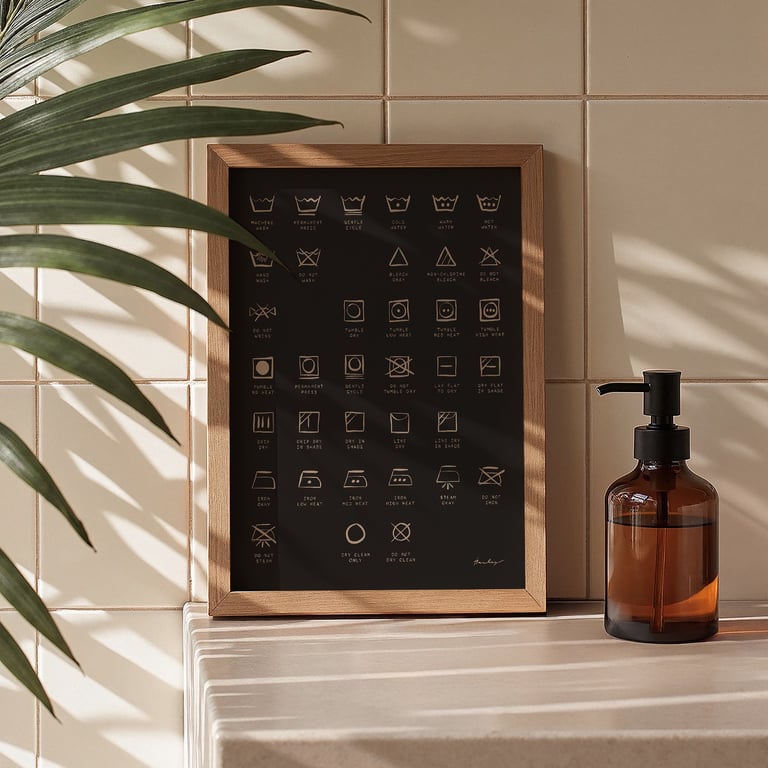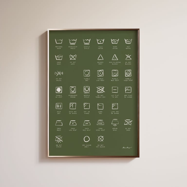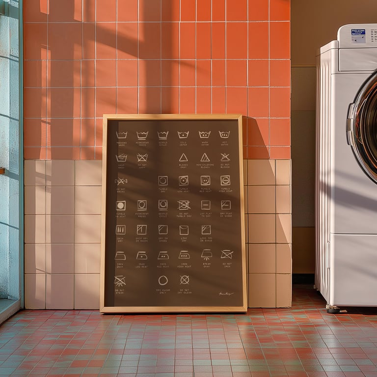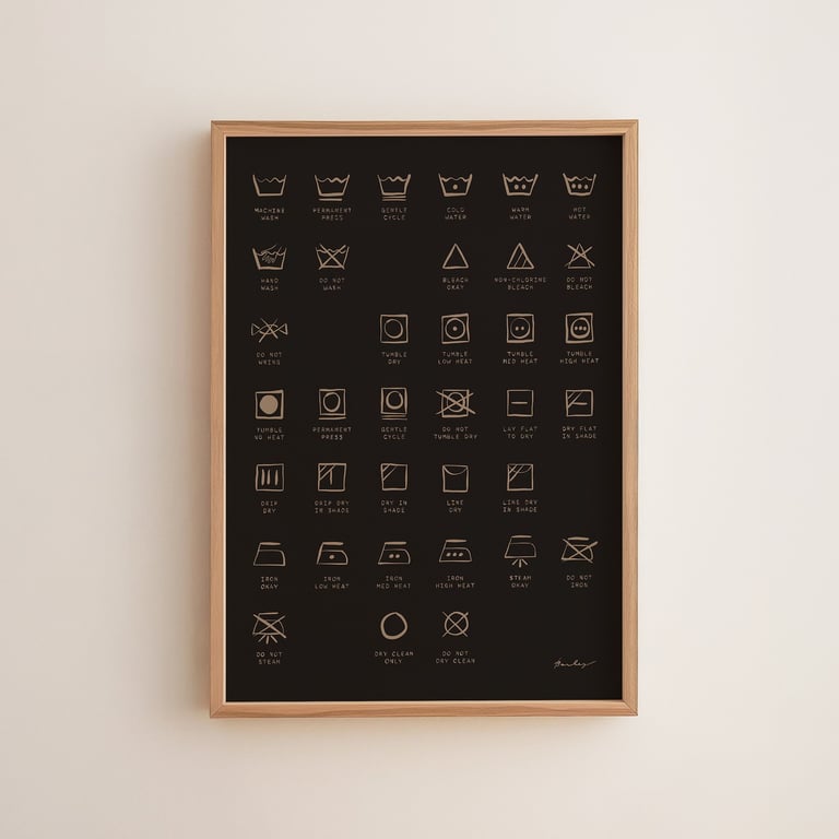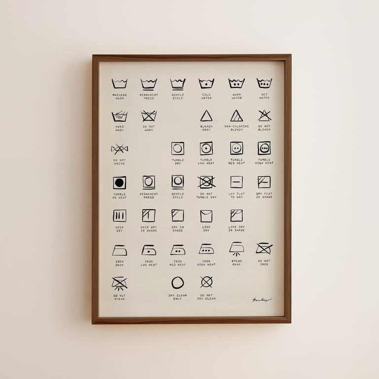 Hand-drawn reference signs the form of art you can hang. All those cryptic icons on your clothing tags, finally decoded in one place. Functional reference art for laundry rooms, utility closets, and more.